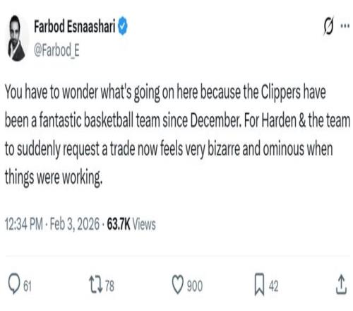 快船队记Farbod Esnaashari第一时间发文吐槽并表示是哈登团队提出交易申请,他写道:“真好奇到底发生了什么,从去年12月份至今快船队表现一直非常出色,结果哈登与其团队突然提出交易申请,这让人感到费解,也让人感到有些不安,尤其是一切顺利时。”