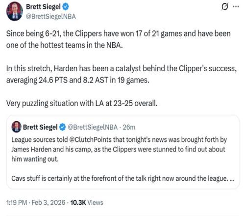 ESPN名记Shams随后发文确认消息真实性,同时跟进表示哈登与快船双方都在讨论能否在交易截止日前离队,并且双方都在寻找感兴趣的下家进行讨论。